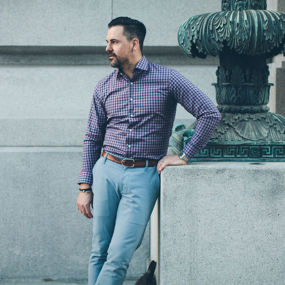 A crisp semi-spread collar in navy plaid. 80s 2 Ply pinpoint oxford. Single-button angled cuff. French front with no pocket. Tailored fit & high armhole. A b...