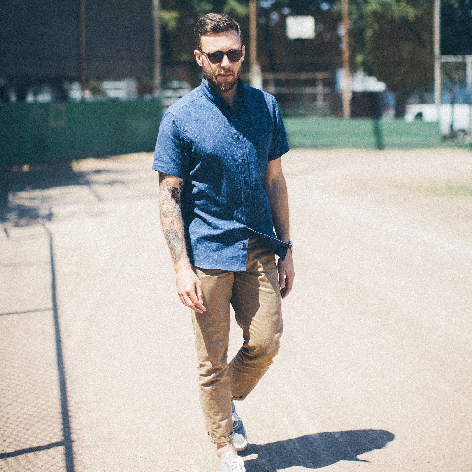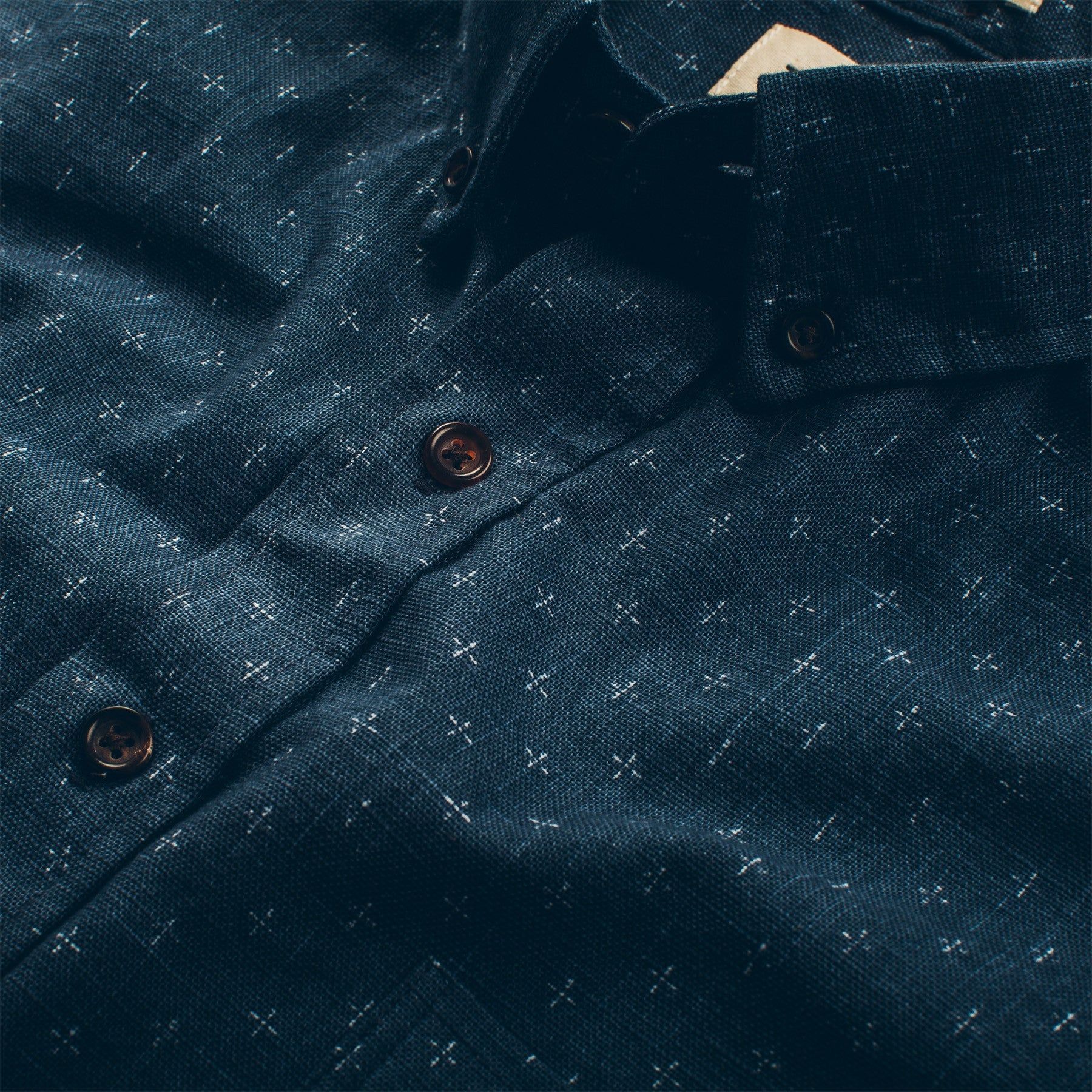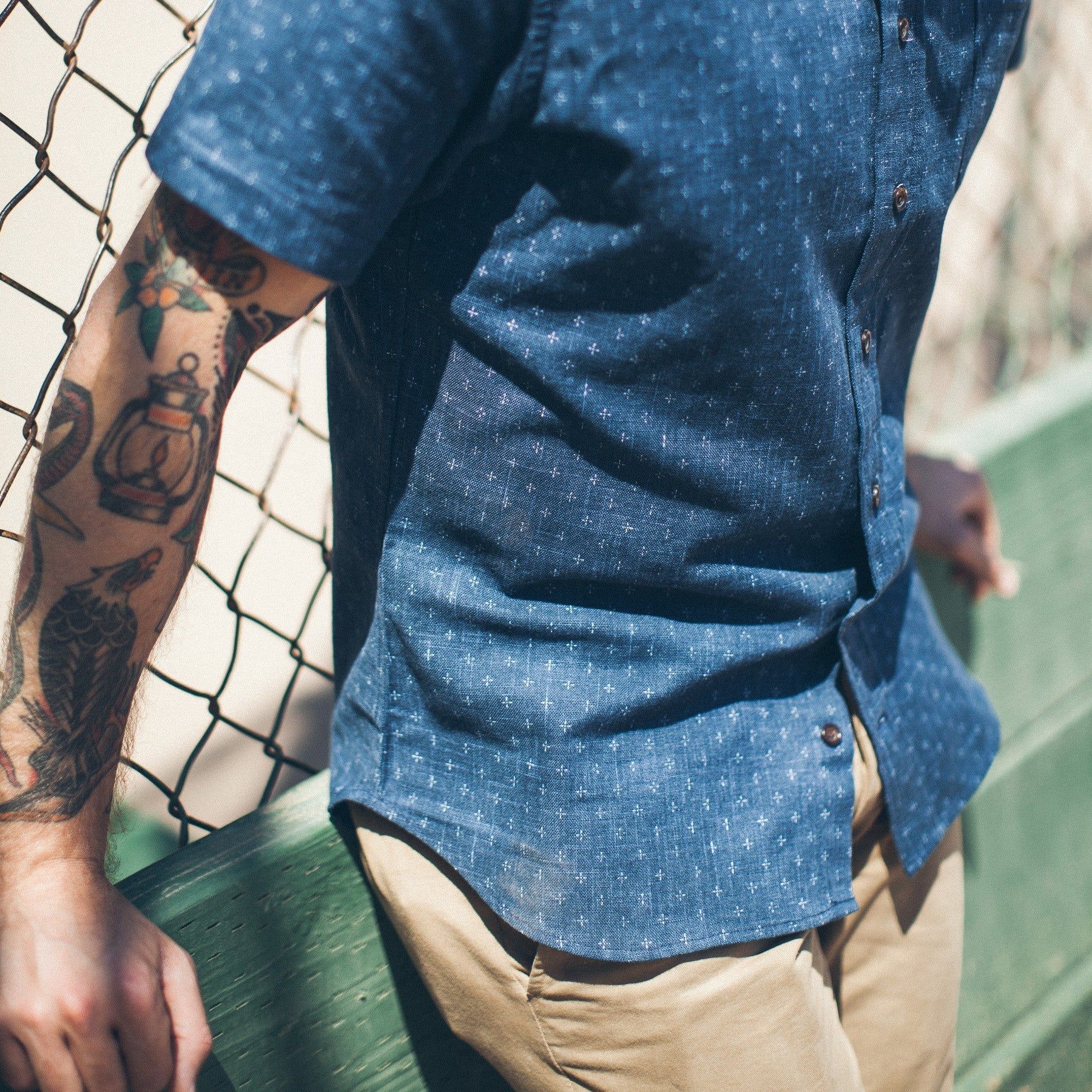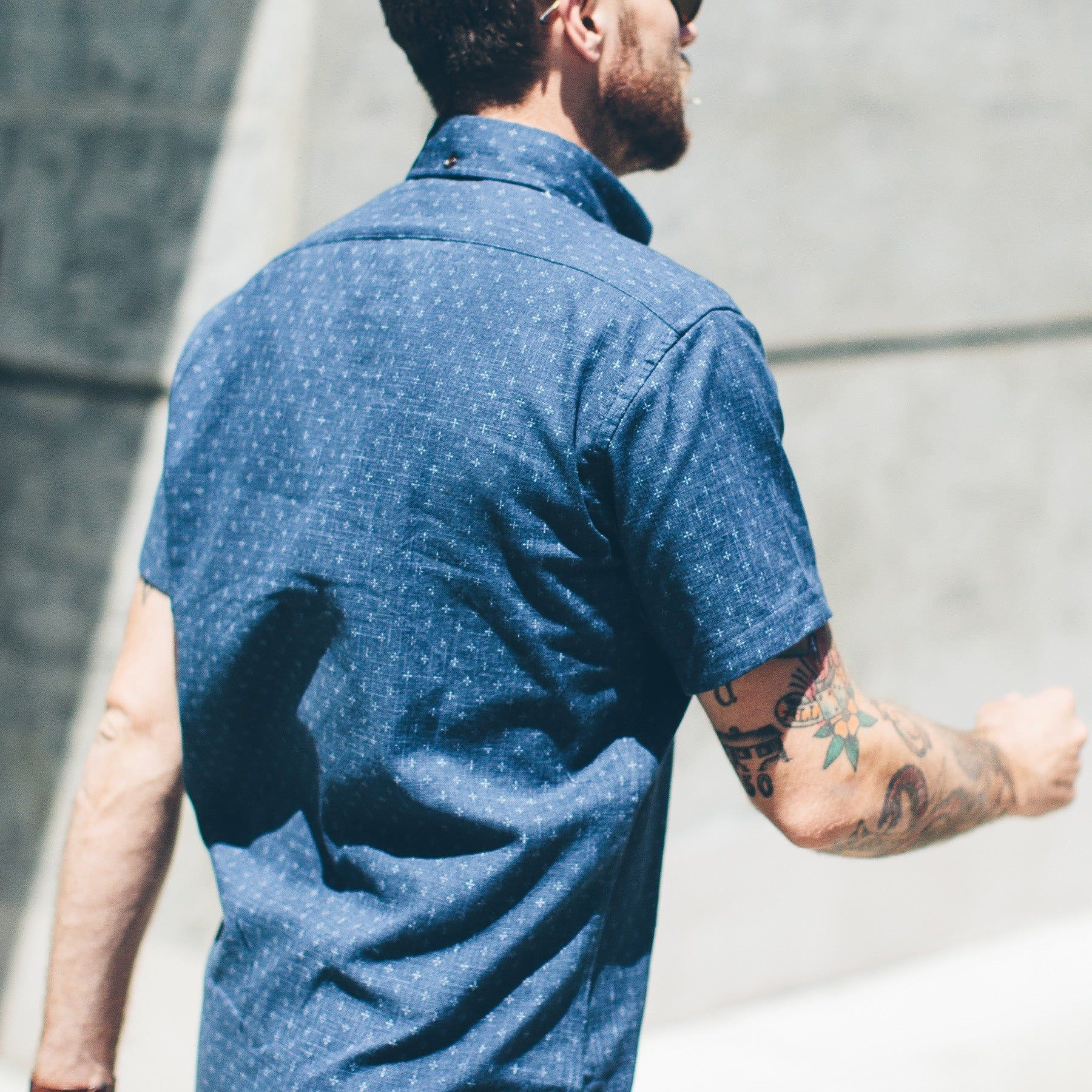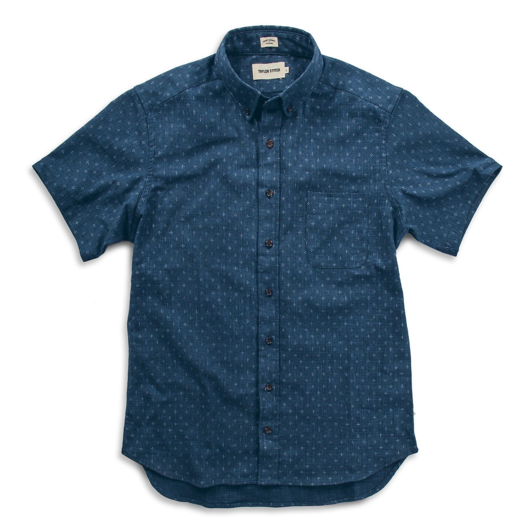 Our staple shirt has a tailored fit with a triple button collar. Now our oxford is available in short sleeves with an Indigo Star print. Shop In-Stock now.