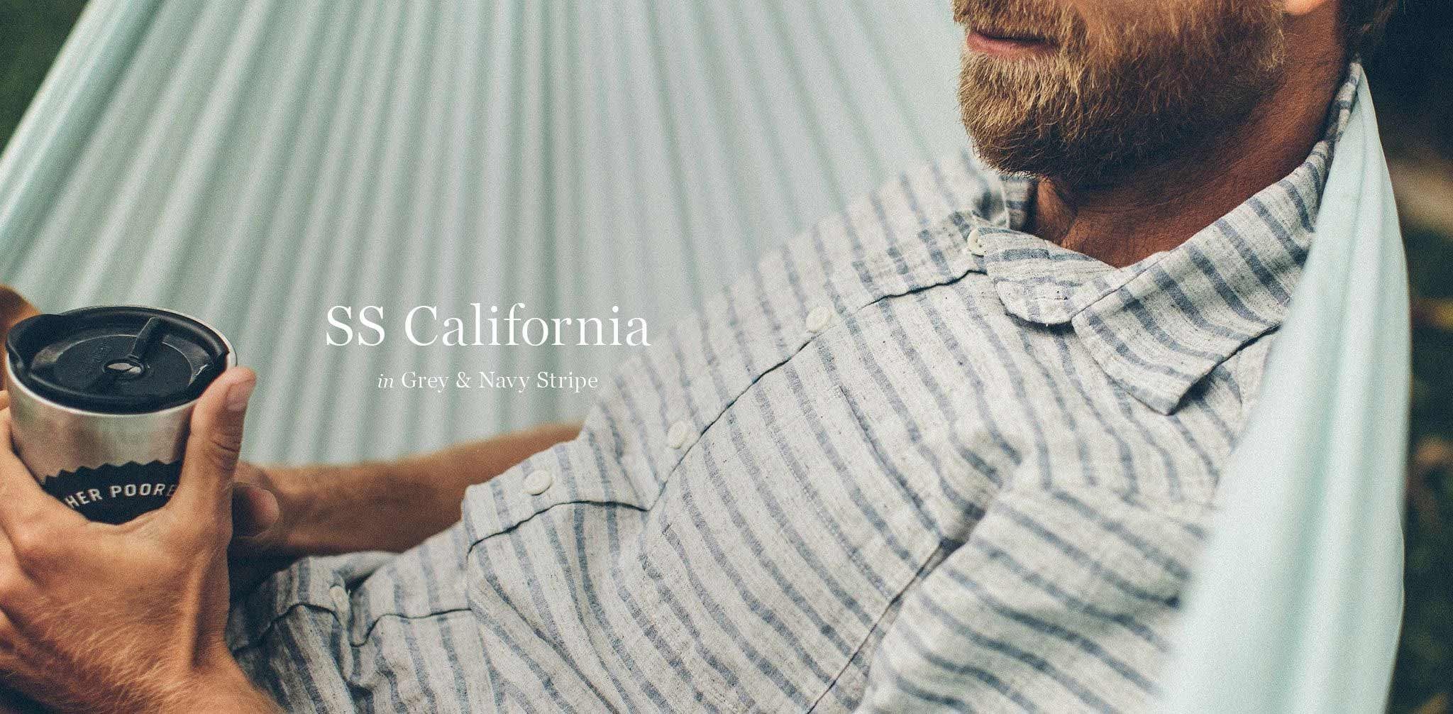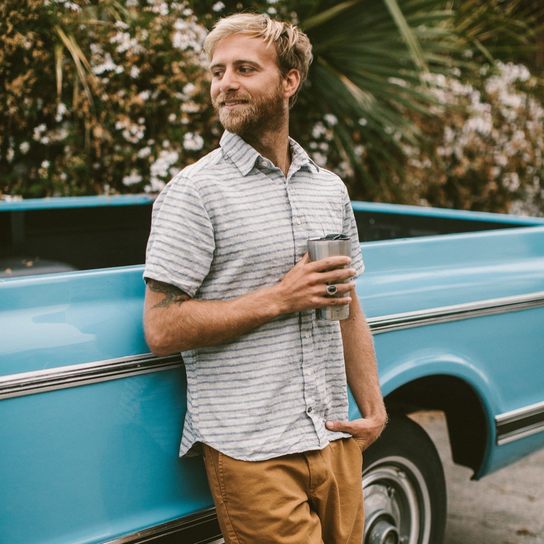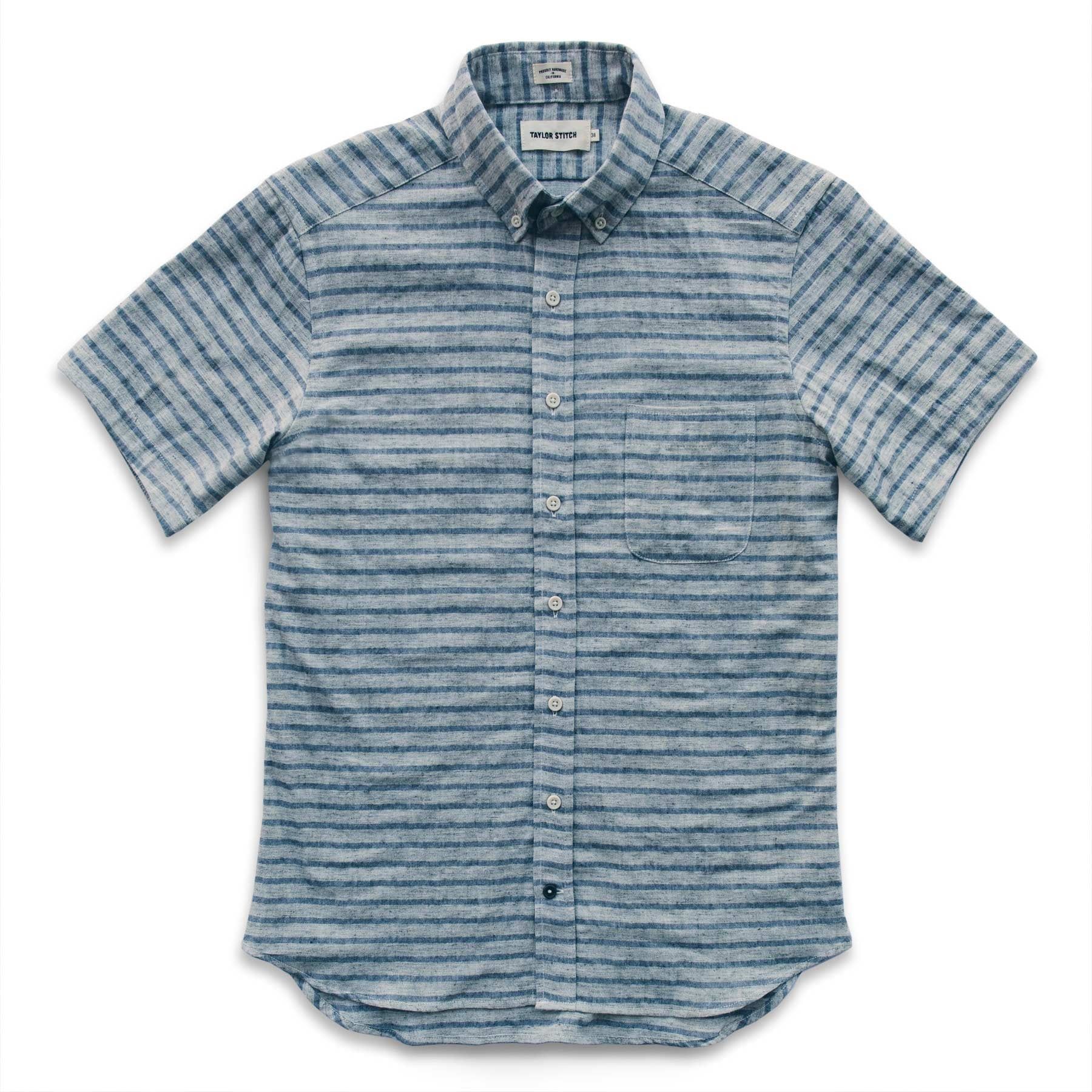 Our staple shirt has a tailored fit with a triple button collar. Now our oxford is available in short sleeves in Grey and Navy Stripes. Shop In-Stock now.